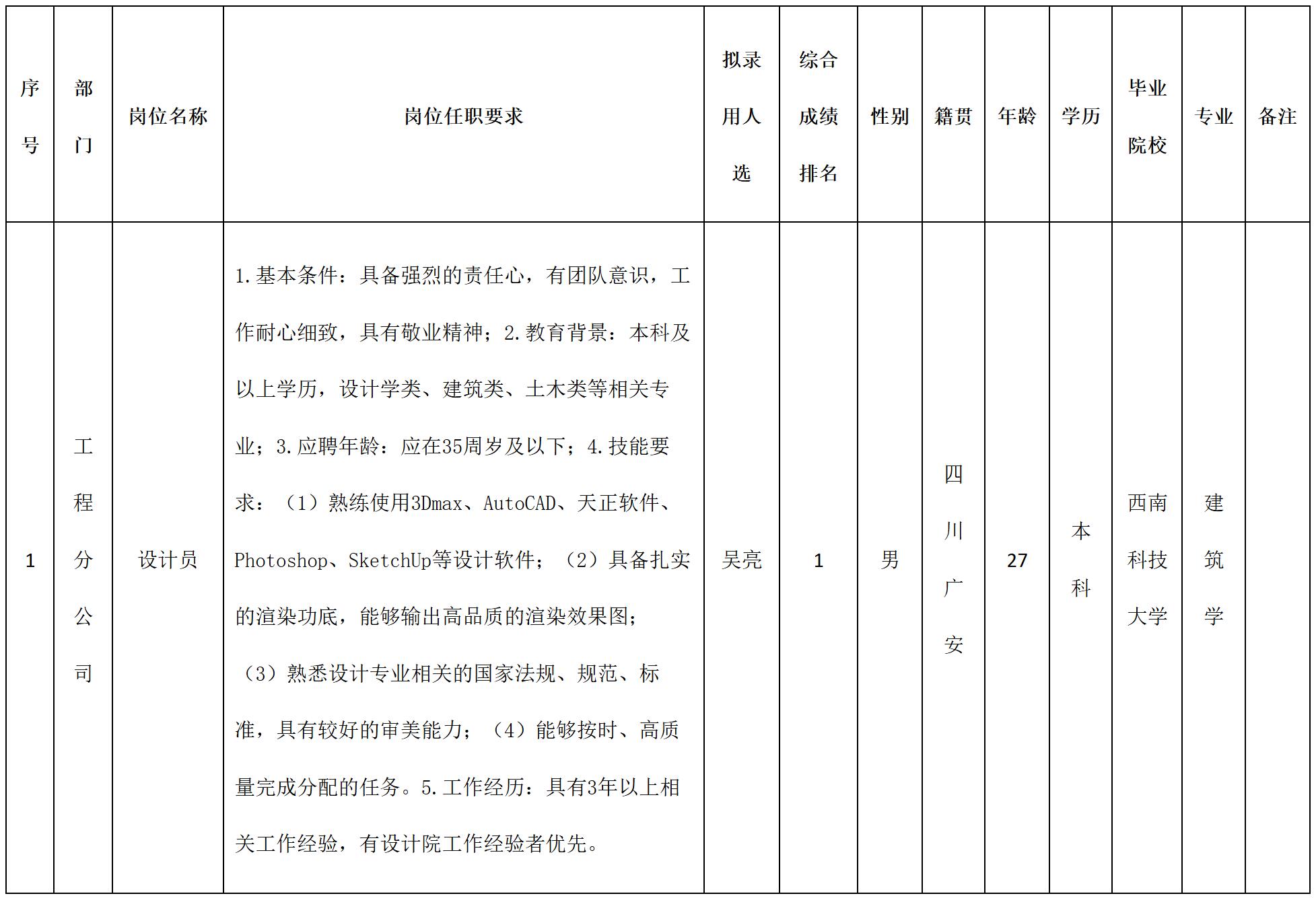 根據(jù)四川湖山電器股份有限公司發(fā)布的招聘公告及招聘相關規(guī)定,經(jīng)筆試、面試、考察、體檢等程序,擬錄用吳亮同志到四川湖山電器股份有限公司工作,現(xiàn)予以公示,具體情況如下: