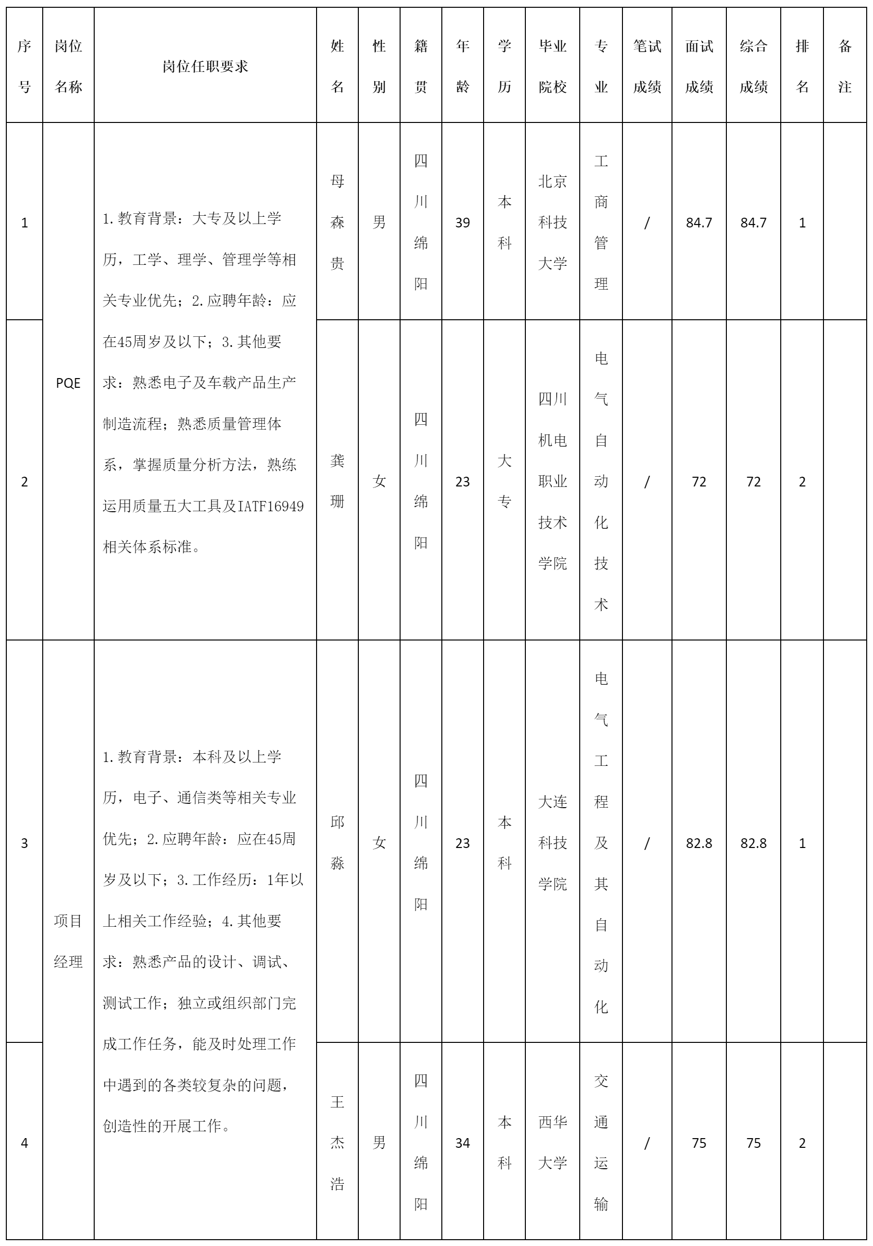 根據四川九州電子科技股份有限公司發布的招聘公告及招聘相關規定,經筆試、面試等程序,現將筆試(面試)成績予以公示。