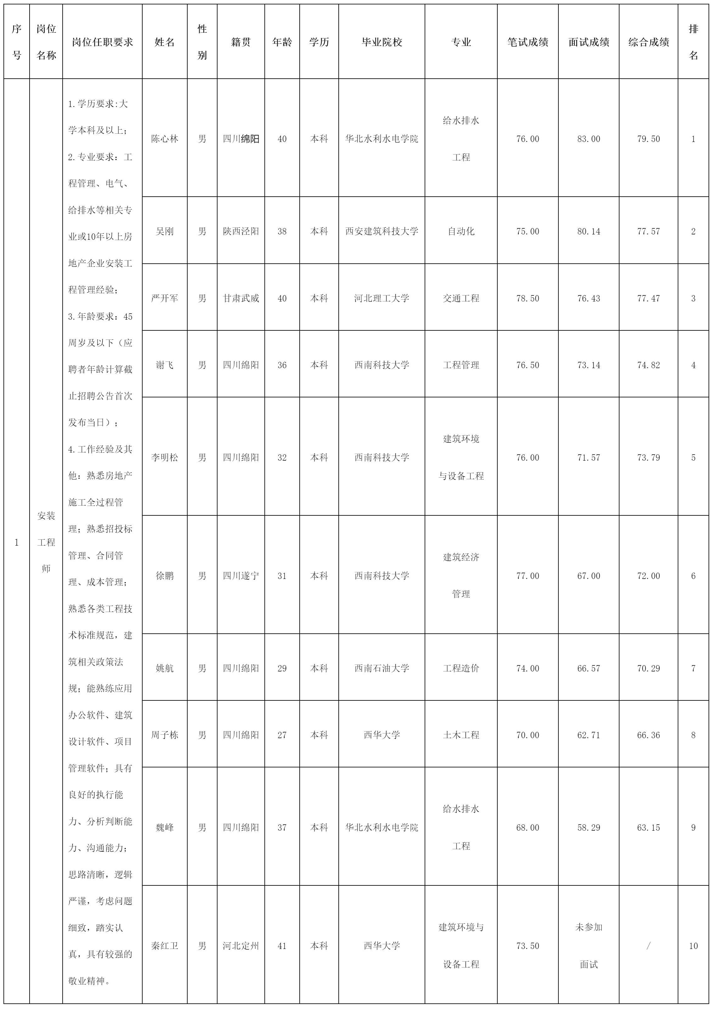 根據綿陽市綿投置地有限公司發布的招聘公告及招聘相關規定,經筆試、面試等程序,現將筆試、面試成績予以公示。