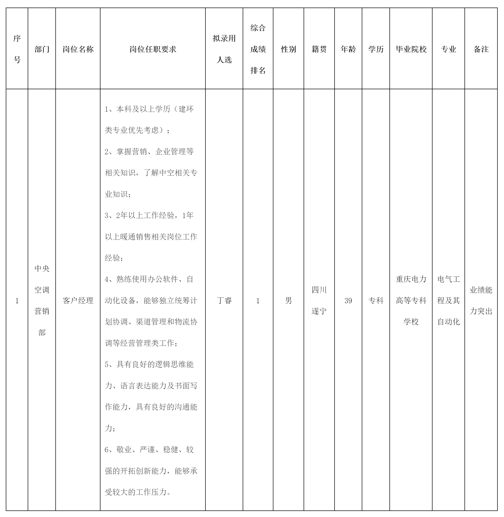 根據四川長虹空調有限公司發布的招聘公告及招聘相關規定,經面試,擬錄用丁睿到長虹空調工作,現予以公示,具體情況如下: