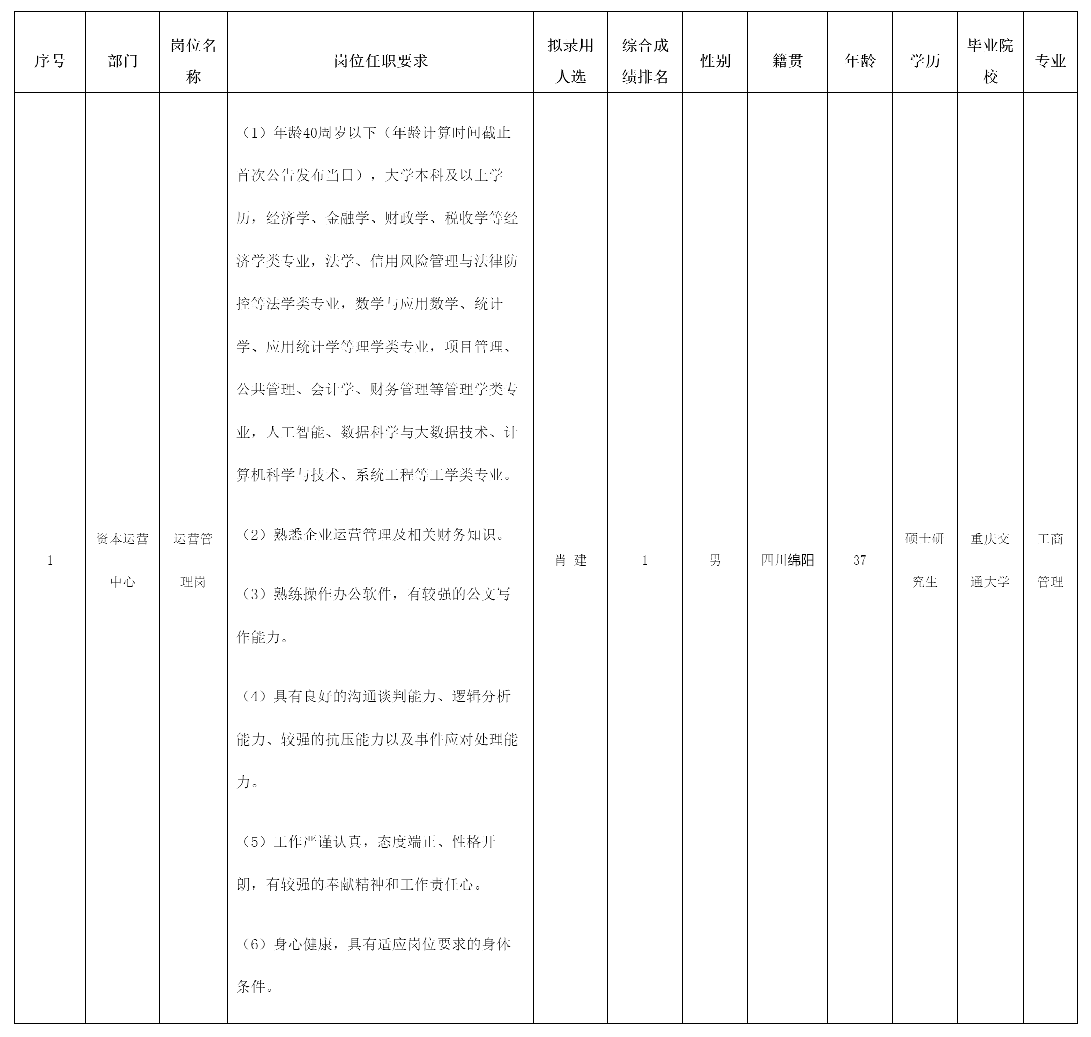 根據綿陽市投資控股(集團)有限公司發布的招聘公告及招聘相關規定,經筆試、面試、考察、體檢等程序,擬錄用肖建同志到綿陽市投資控股(集團)有限公司工作,現予以公示,具體情況如下: