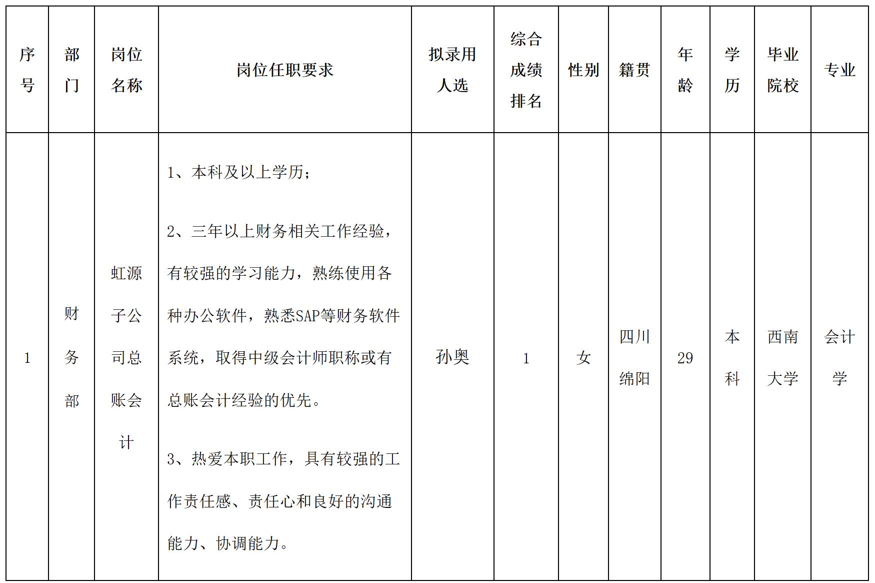 根據(jù)四川長虹電源股份有限公司發(fā)布的招聘公告及招聘相關(guān)規(guī)定,經(jīng)面試、考察、體檢等程序,擬錄用孫奧同志到我司工作,現(xiàn)予以公示,具體情況如下:
