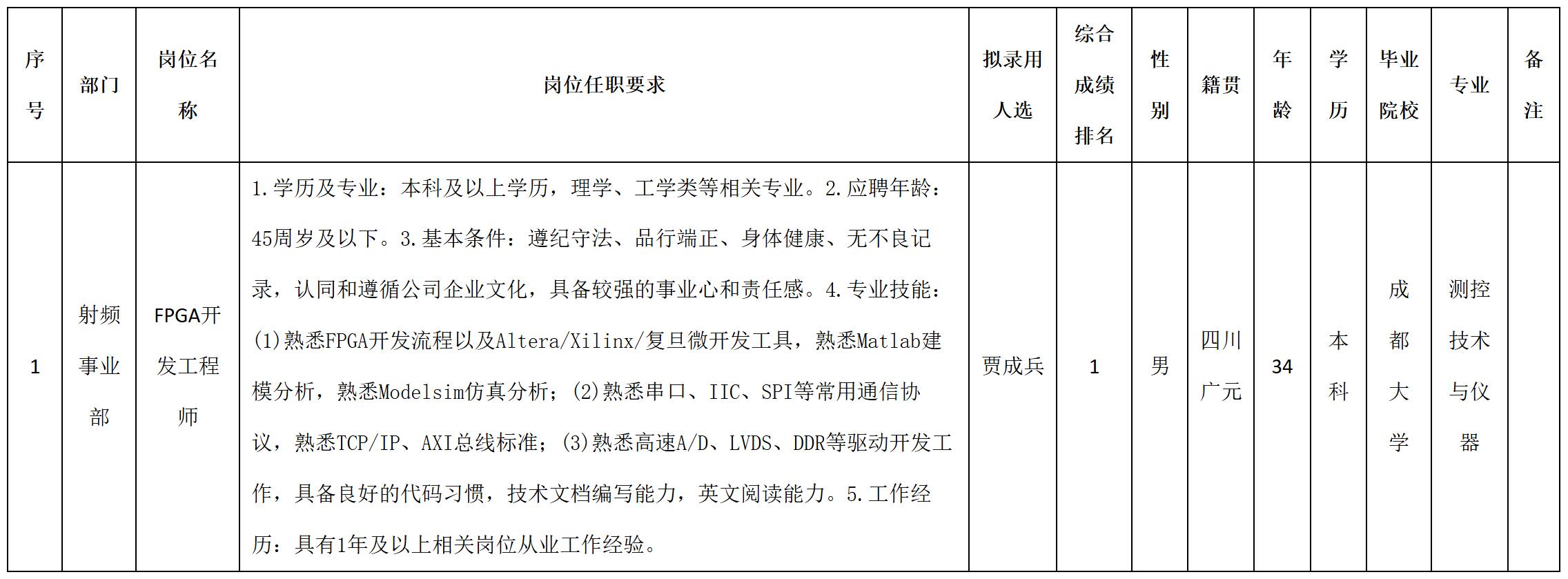根據四川九強通信科技有限公司發布的招聘公告及招聘相關規定,經筆試、面試、考察、體檢等程序,擬錄用賈成兵同志到四川九強通信科技有限公司工作,現予以公示,具體情況如下: