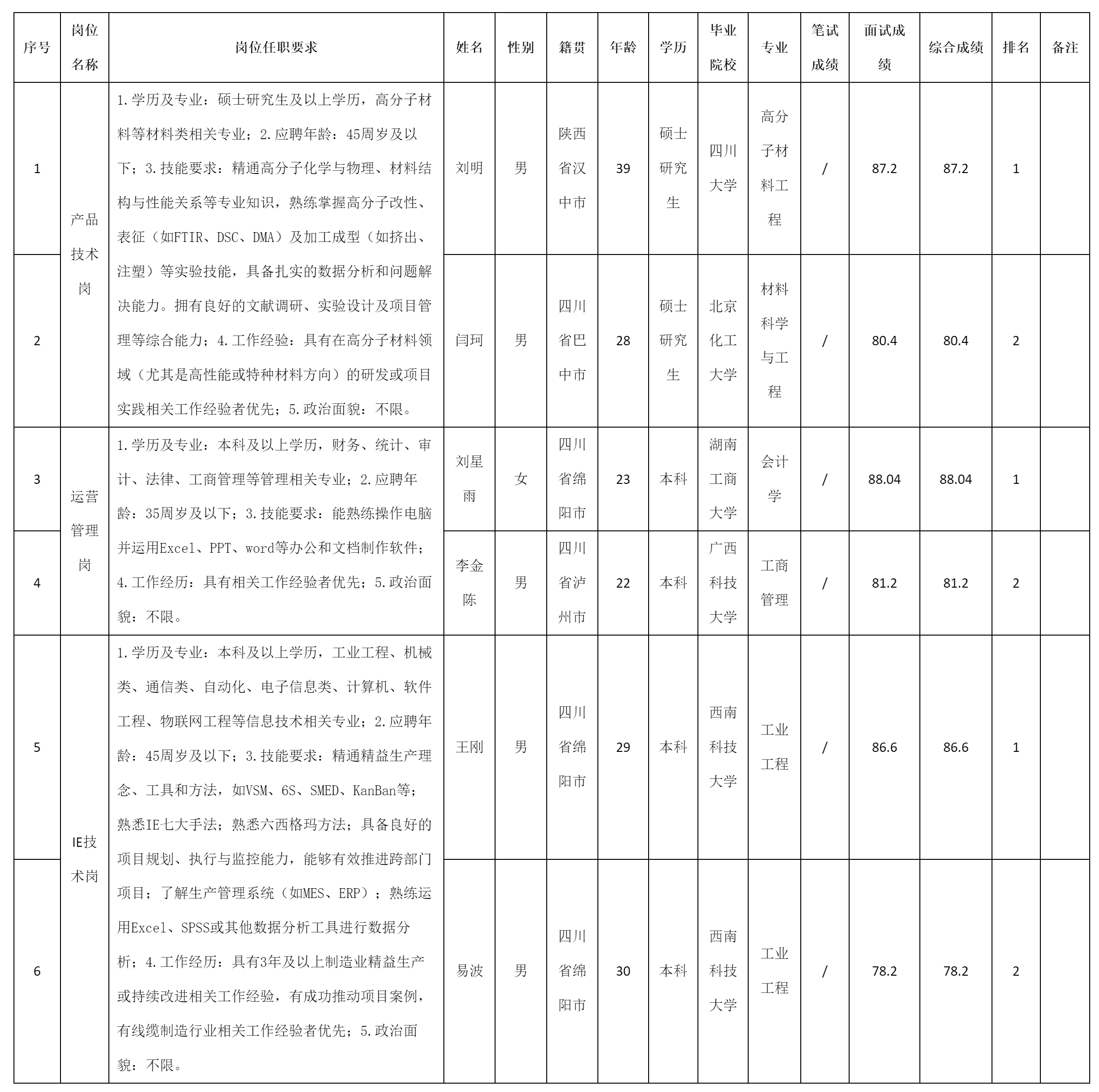 根據(jù)四川九洲線(xiàn)纜有限責(zé)任公司發(fā)布的招聘公告及招聘相關(guān)規(guī)定,經(jīng)筆試、面試等程序,現(xiàn)將筆試(面試)成績(jī)予以公示。
