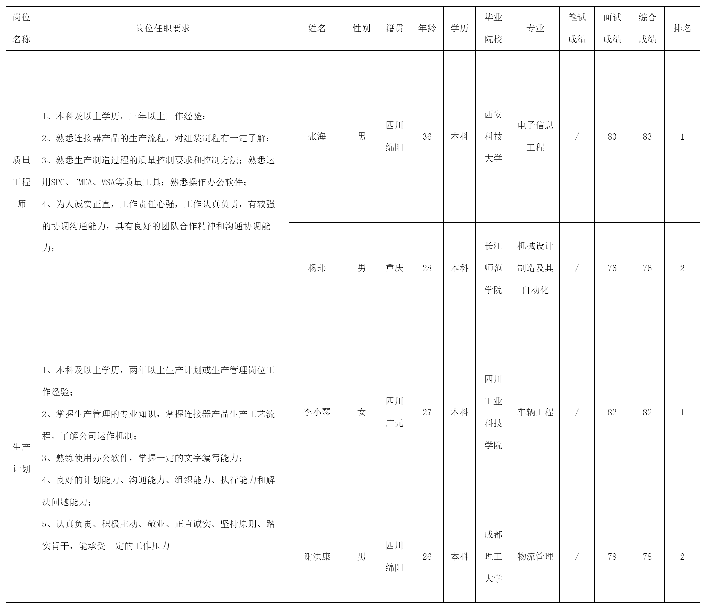 根據四川華豐科技股份有限公司發布的招聘公告及招聘相關規定,經筆試、面試等程序,現將筆試(面試)成績予以公示。