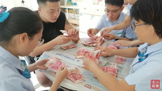 工作人員嚴格按照規定專業耐心地進行剝離、清理、核對,避免造成二次損毀并確保每張紙幣的防偽特征與殘損程度鑒定精準。經過近2小時清點,成功為客戶兌換1.8萬元,挽回了近90%的損失。