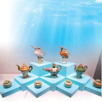 在“深藍寶藏”特展的第三部分“巧繕煥新”,兩座巨大的玻璃脫鹽池被直接搬進展廳。脫鹽池中正是剛出水不久的文物。觀眾可以親眼看到,這些“國寶”如何在文保人員的精心呵護下,進行清洗、脫鹽、加固,從而“延年益壽”的。