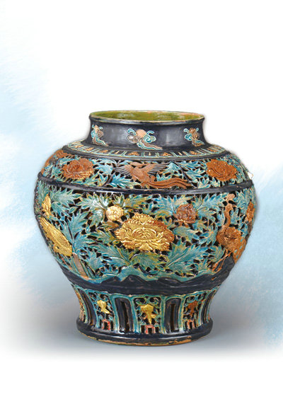 琺華貼金鏤空孔雀牡丹紋大罐。圖為中國(海南)南海博物館提供