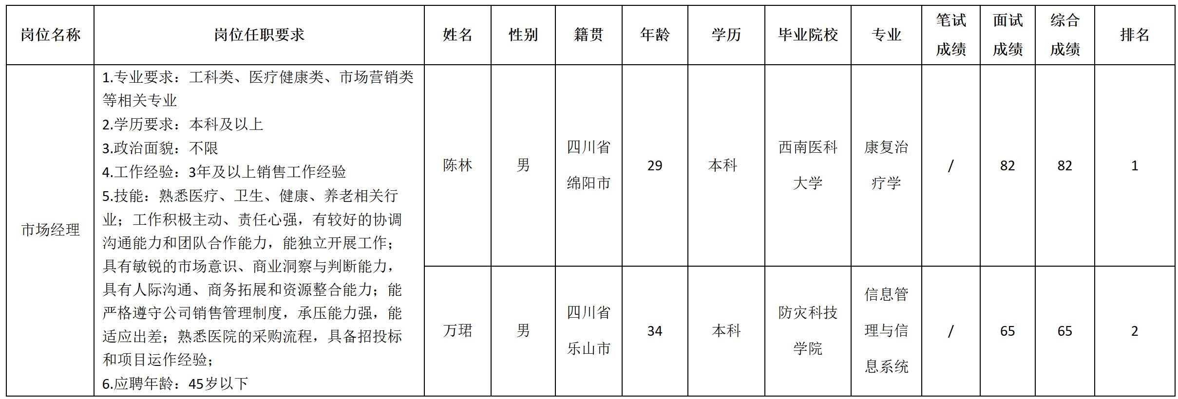 根據四川長虹智慧健康科技有限公司發布的招聘公告及招聘相關規定,經筆試、面試等程序,現將筆試(面試)成績予以公示。