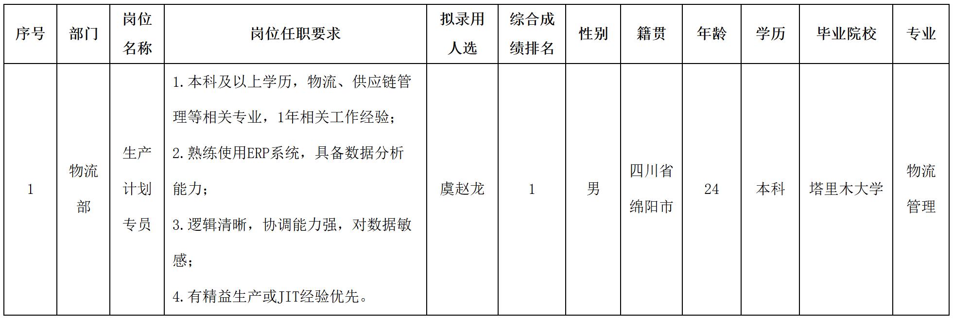 根據(jù)四川波鴻實(shí)業(yè)有限公司發(fā)布的招聘公告及招聘相關(guān)規(guī)定,經(jīng)面試、體檢等程序,擬錄用虞趙龍同志到威斯卡特(綿陽)汽車零部件制造有限公司工作,現(xiàn)予以公示,具體情況如下: