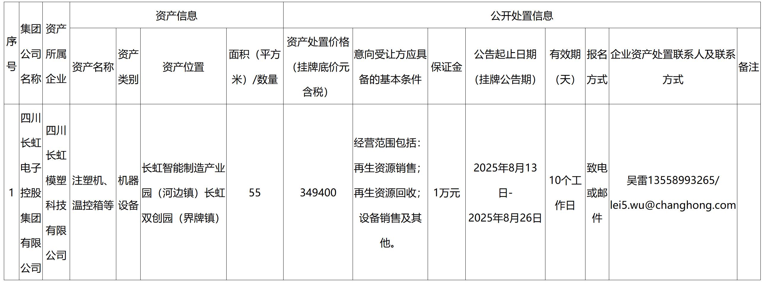 四川長虹模塑科技有限公司企業資產處置公告