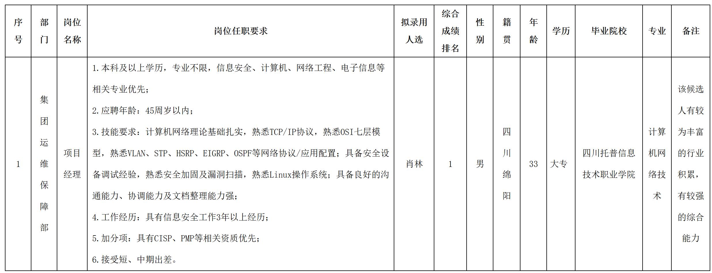 根據四川虹信軟件股份有限公司發布的招聘公告及招聘相關規定,經面試、考察、體檢等程序,擬錄用肖林同志到四川虹信軟件股份有限公司工作,現予以公示,具體情況如下: