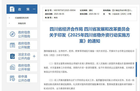 為全力以赴做好2025年穩外資工作,四川省經濟合作局、四川省發展改革委日前聯合印發《2025年四川省穩外資行動實施方案》(以下簡稱《方案》)?!斗桨浮穱@推動高水平對外開放、提高外商投資促進水平、增強開放平臺效能、加大外商投資服務保障力度四個方面,提出19條具體舉措,為外資在川發展鋪路搭橋。
