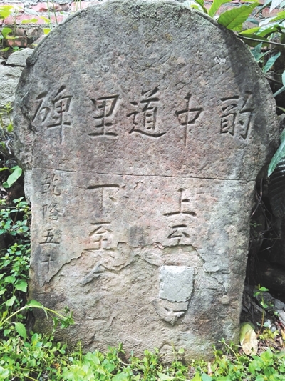 沿著游仙街道芙蓉社區(qū)附近的一條小道前行,不久便能見到酌中道里碑。現(xiàn)場(chǎng)目測(cè),這通石碑高約1米,寬約80厘米,碑頂為圓弧形,碑座呈方形。由于長(zhǎng)期暴露在室外,受風(fēng)雨侵蝕及歲月沖刷,石碑風(fēng)化嚴(yán)重,許多字跡已模糊不清。碑額刻有“酌中道里碑”字樣,碑身正中依稀可見“上至××”“下至××”等字樣,碑文落款為“乾隆五十年”。結(jié)合古蜀道線路資料分析,酌中道里碑所在的鄉(xiāng)間小道,正是古蜀道曾經(jīng)的行經(jīng)之處。