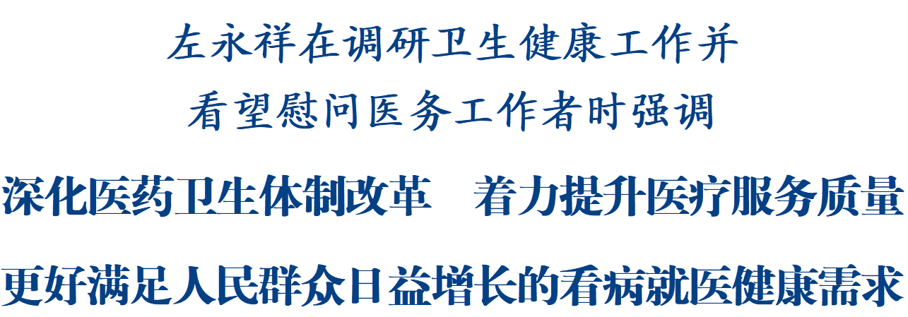 在第八個中國醫師節即將到來之際,8月18日,省委常委、市委書記左永祥前往市緊急救援指揮中心、市屬醫院、基層衛生院調研衛生健康工作,并看望慰問醫務工作者,代表市委、市政府向全市廣大醫務工作者致以節日問候和崇高敬意。他強調,要深入學習貫徹習近平總書記關于健康中國建設的重要論述和對四川工作系列重要指示精神,全面落實黨中央和省委部署要求,以實施健康優先發展戰略、健康中國戰略、人口發展戰略為引領,深化醫藥衛生體制改革,著力提升醫療服務質量,更好滿足人民群眾日益增長的看病就醫健康需求。