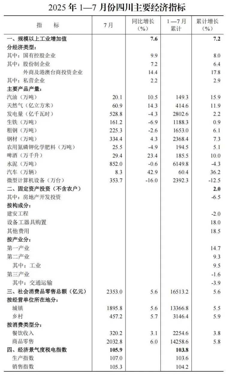 8月18日,四川省統計局發布2025年1—7月四川省國民經濟主要指標數據。數據顯示,1—7月,全省規模以上工業增加值同比增長7.2%,增速比全國快0.9個百分點;全省實現社會消費品零售總額16513.2億元,同比增長5.6%,增速比全國快0.8個百分點。
