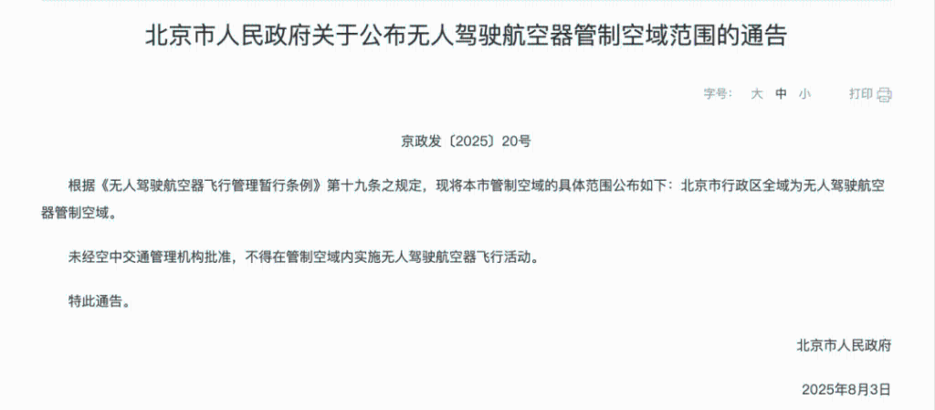 8月4日,北京市人民政府對外發(fā)布的《北京市人民政府關(guān)于公布無人駕駛航空器管制空域范圍的通告》(網(wǎng)絡(luò)截圖)