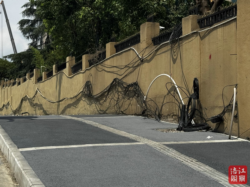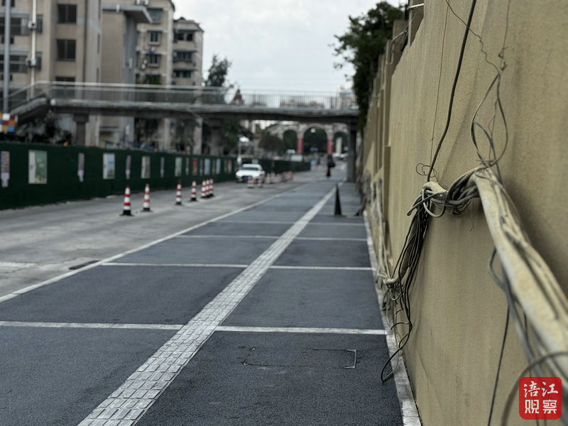 8月19日下午,記者來到施工現場看到,機動車道正在進行半幅施工,人行道區域已鋪設平整,煥然一新。然而,靠近外國語學校一側的墻面上,粗細不一、顏色各異的線纜或懸掛于墻、或成卷垂落在地,顯得十分凌亂。