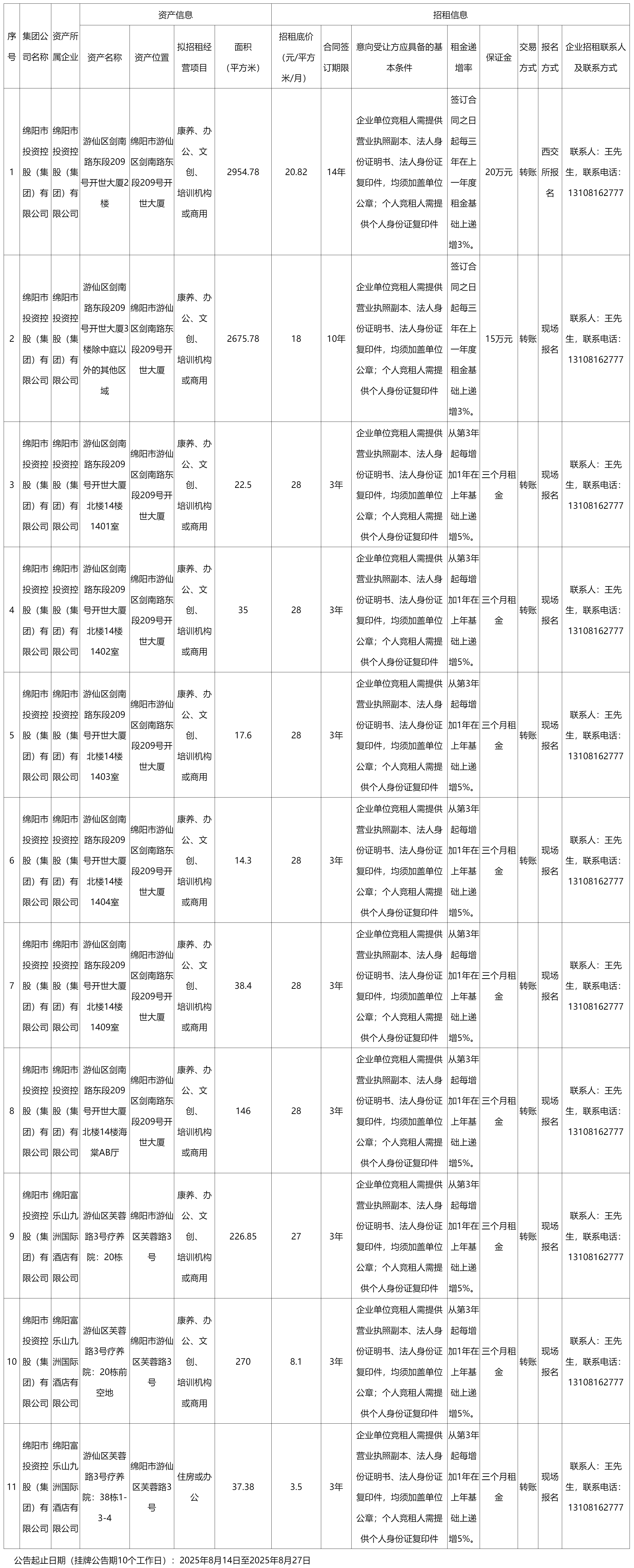 綿陽富樂山九洲國際酒店有限公司資產出租公告