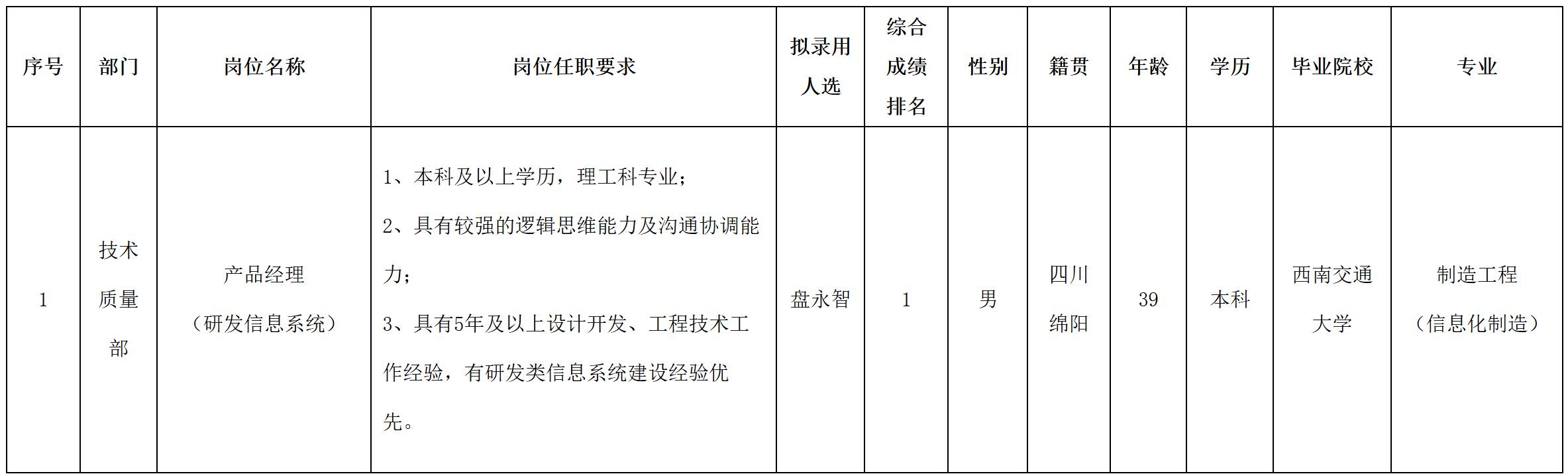 根據(jù)四川華豐科技股份有限公司發(fā)布的招聘公告及招聘相關(guān)規(guī)定,經(jīng)面試等程序,擬錄用盤永智同志到四川華豐科技股份有限公司工作,現(xiàn)予以公示,具體情況如下:
