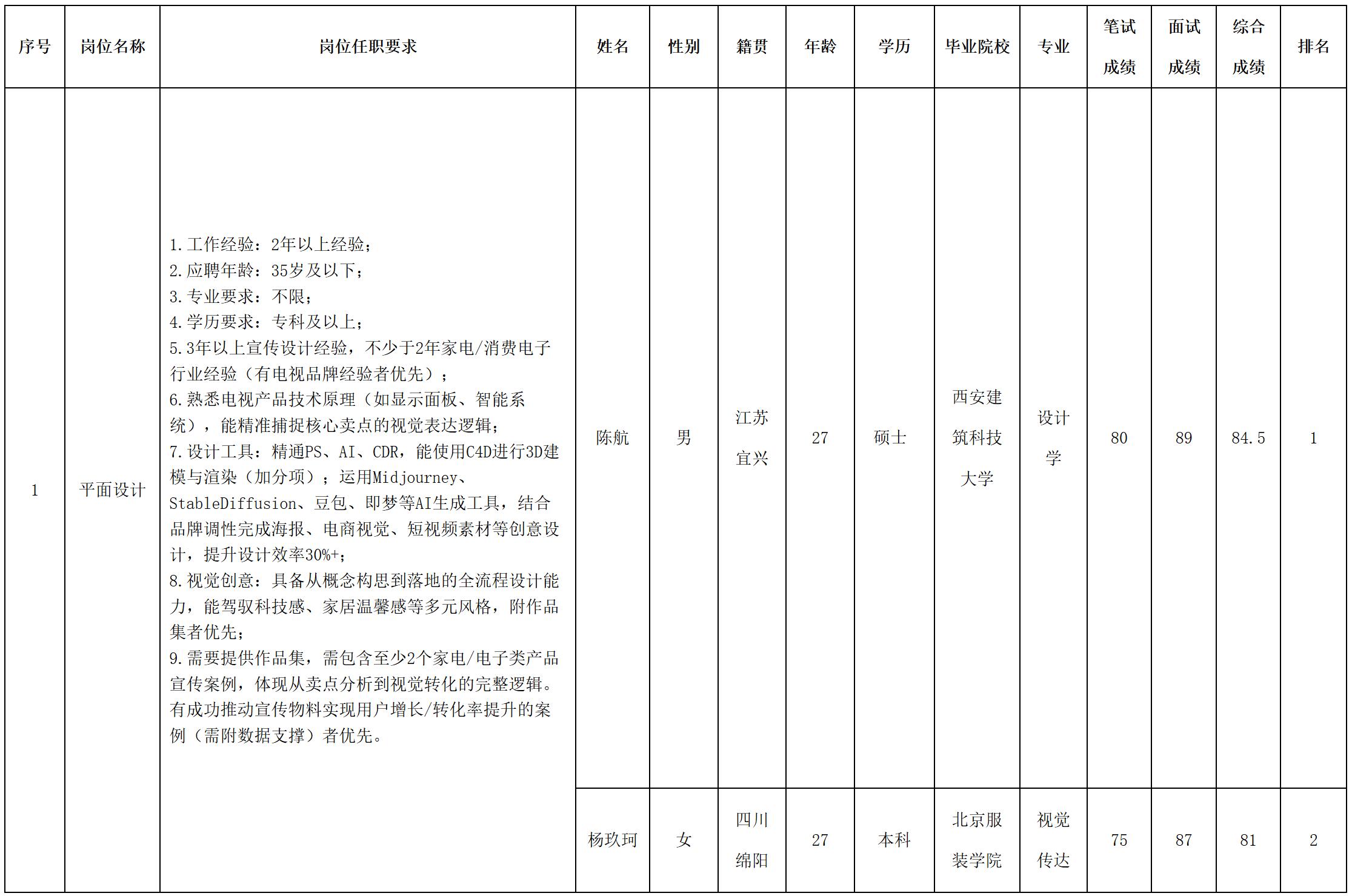 根據長虹·美菱中國區營銷總部發布的招聘公告及招聘相關規定,經面試程序,現將面試成績予以公示。