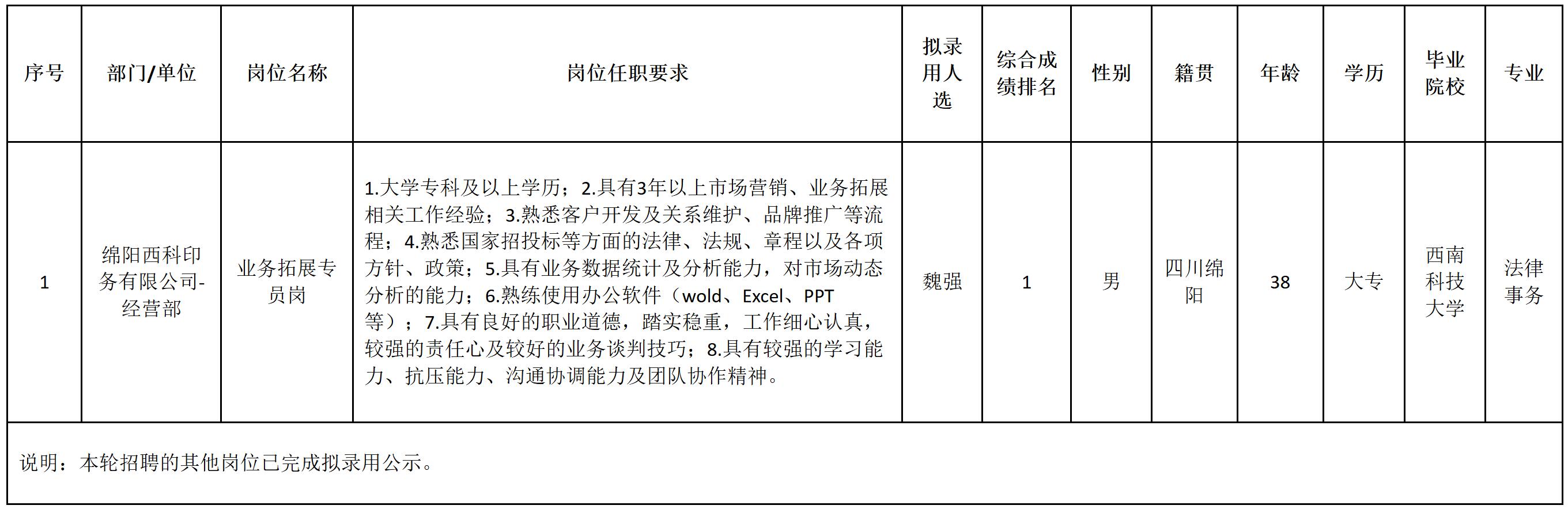 根據交發實業發布的招聘公告及招聘相關規定,經初試、復試、體檢等程序,擬錄用魏強同志到交發實業下屬西科印務工作。現予以公示,具體情況如下: