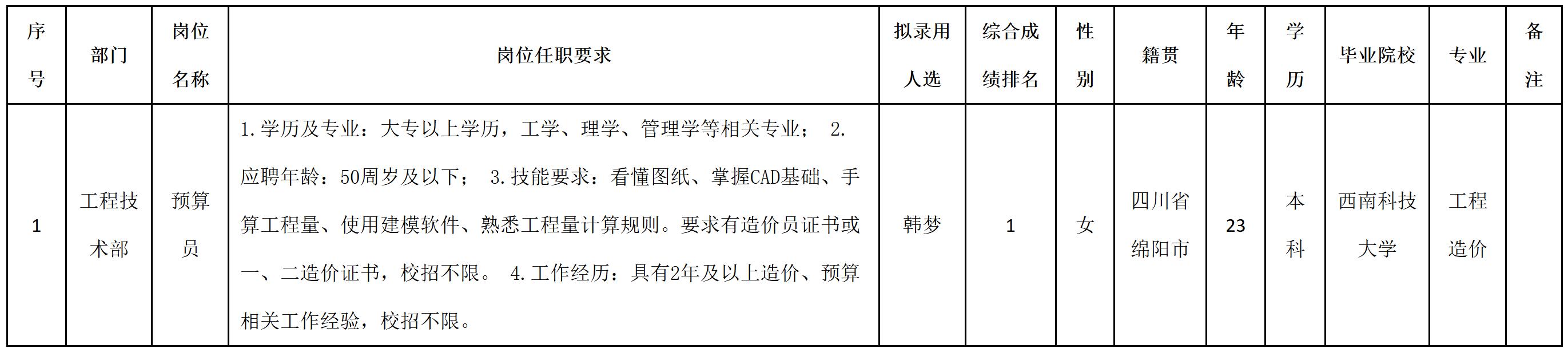 根據四川九洲建筑工程有限責任公司發布的招聘公告及招聘相關規定,經筆試、面試、考察、體檢等程序,擬錄用韓夢同志到四川九洲建筑工程有限責任公司工作,現予以公示,具體情況如下: