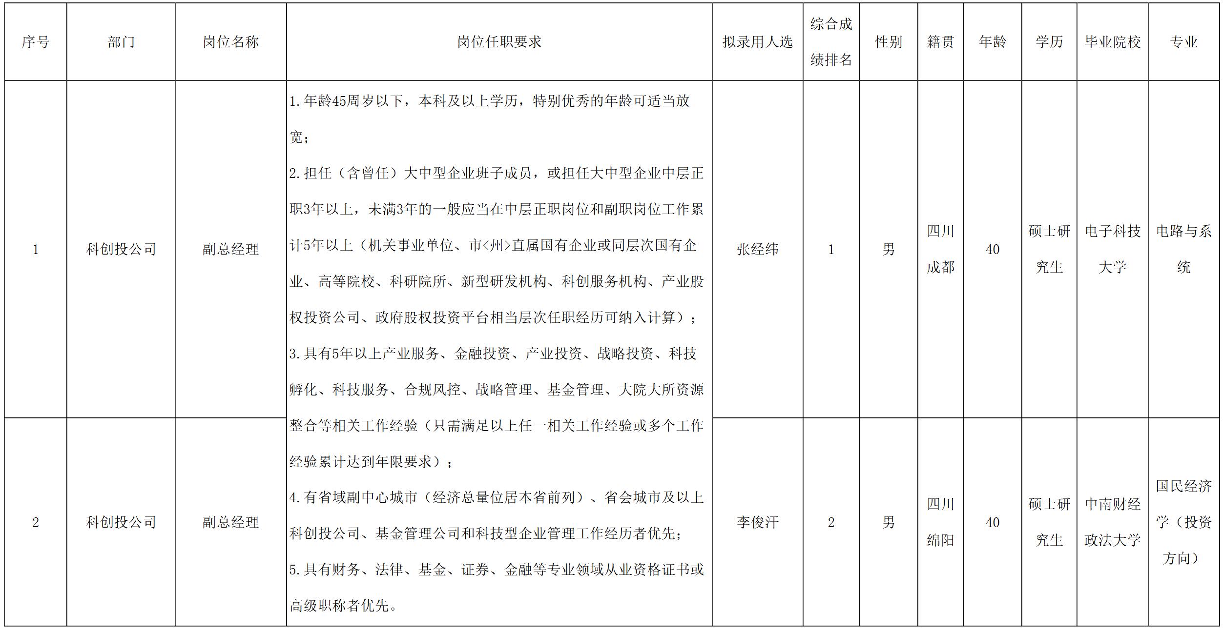 根據綿陽科技城科技創新投資有限公司發布的選聘公告及選聘相關規定,經能力測評、面試、考察、體檢等程序,擬錄用張經緯、李俊汗同志到綿陽科技城科技創新投資有限公司工作,現予以公示,具體情況如下: