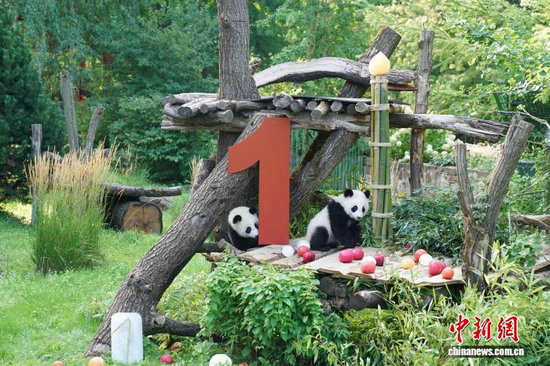 紅色木制“1”字、以甜菜根和胡蘿卜汁為原料的冰彈珠、竹子生日蠟燭……當地時間22日,旅德大熊貓雙胞胎“夢好”和“夢甜”在柏林動物園熊貓園的室外活動場地上收獲了滿滿的生日驚喜。