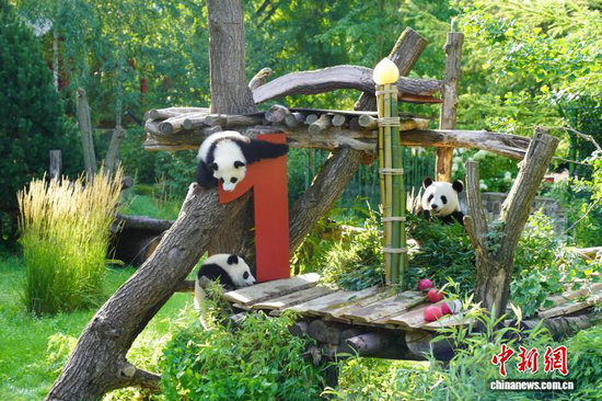 當地時間8月22日,旅德大熊貓雙胞胎“夢好”和“夢甜”在柏林動物園歡度一周歲生日。圖為“夢好”和“夢甜”在媽媽“夢夢”(右一)陪伴下玩耍。中新社記者 馬秀秀 攝