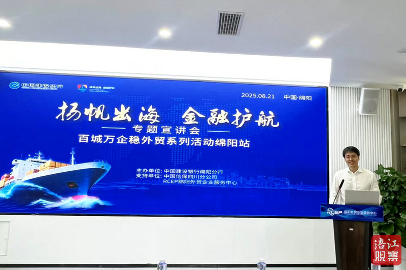 8月21日,在綿陽市商務局、中國人民銀行綿陽市分行、國家外匯管理局綿陽市分局的指導下,中國建設銀行綿陽分行、中國出口信用保險公司四川分公司、RCEP綿陽外貿企業服務中心聯合開展“揚帆出海 金融護航——百城萬企穩外貿系列活動綿陽站”暨“綿動全球”外貿沙龍活動(第十二期)——“保穩提質 助力川品出海——蜀企揚帆·銀保同行”、2025年“聚匯綿州”制造業及科技客群匯率避險培訓會。
