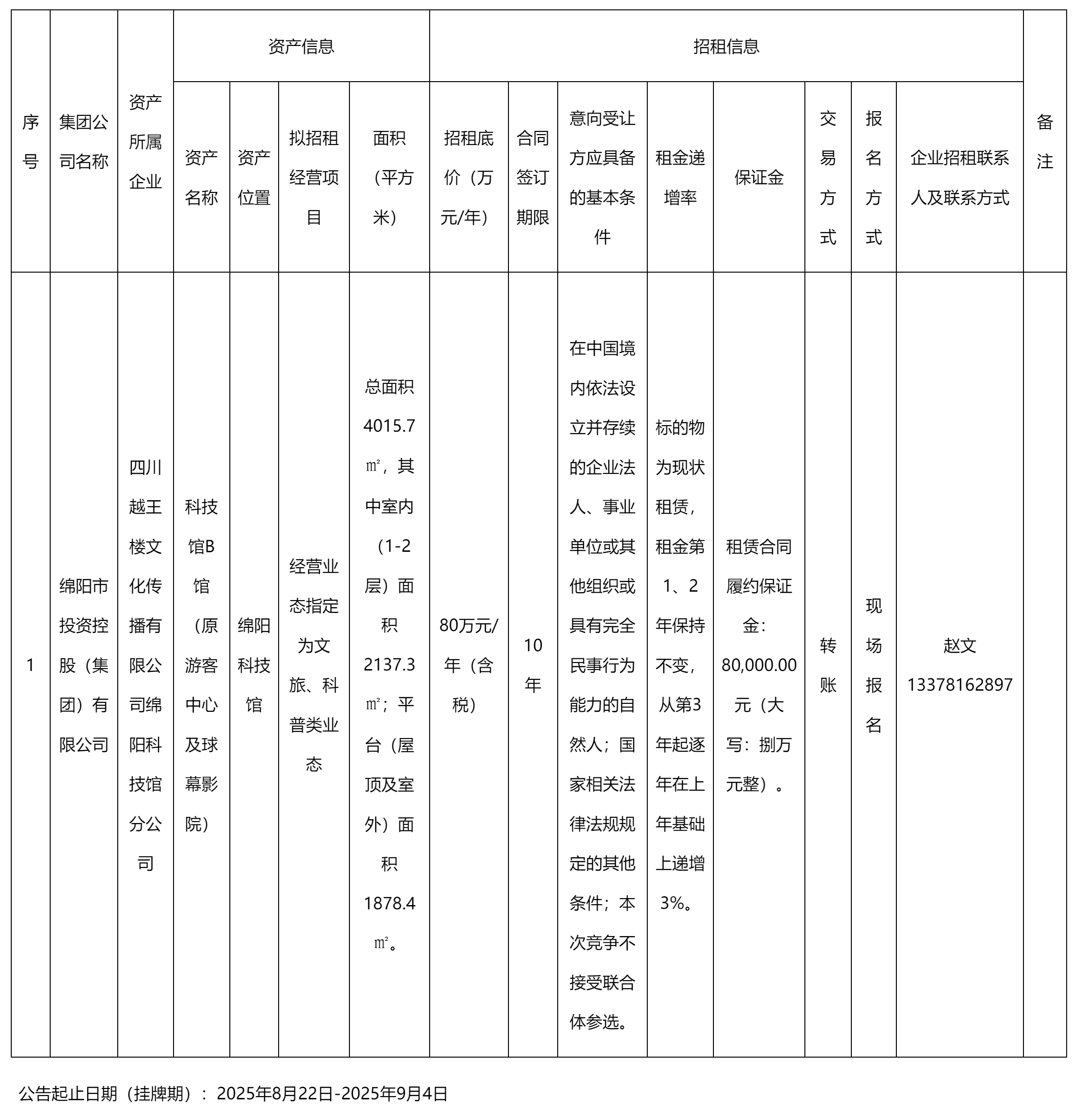 四川越王樓文化傳播有限公司綿陽(yáng)科技館分公司資產(chǎn)出租公告