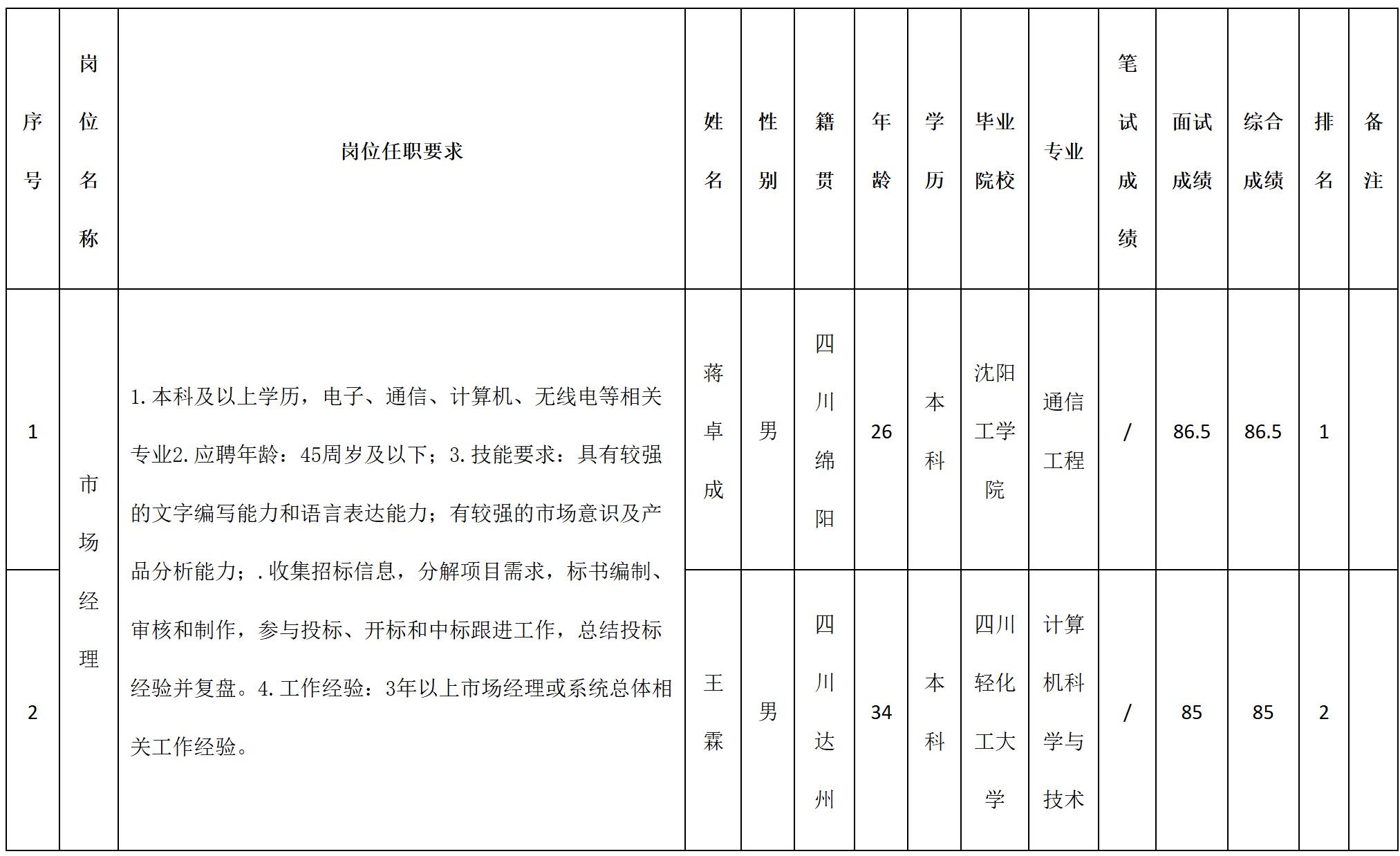 根據四川九洲防控科技有限責任公司發布的招聘公告及招聘相關規定,經筆試、面試等程序,現將筆試(面試)成績予以公示。