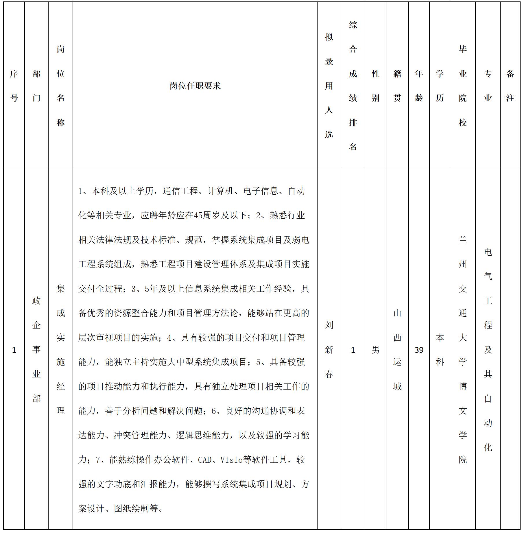 根據四川九洲投資控股集團有限公司軟件與數據智能軍團發布的招聘公告及招聘相關規定,經筆試、面試、考察、體檢等程序,擬錄用劉新春同志到四川九洲投資控股集團有限公司軟件與數據智能軍團工作,現予以公示,具體情況如下:
