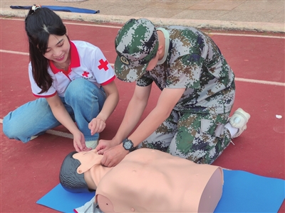 綿陽新聞網(wǎng)訊 “按壓時找準(zhǔn)位置,頻率保持在每分鐘100至120次,深度5至6厘米,這樣能有效幫助心臟驟停的人恢復(fù)血液循環(huán)。”8月28日,在綿陽中學(xué)高一新生軍訓(xùn)現(xiàn)場,綿陽市紅十字會急救老師走進(jìn)軍訓(xùn)隊(duì)伍,為高一新生培訓(xùn)急救知識。活動現(xiàn)場,紅十字會急救老師們通過急救知識講解演示的方式,用“理論+實(shí)操”的形式,教會高一新生們心肺復(fù)蘇、AED(自動體外除顫器)使用、海姆立克急救法等核心救命技能。