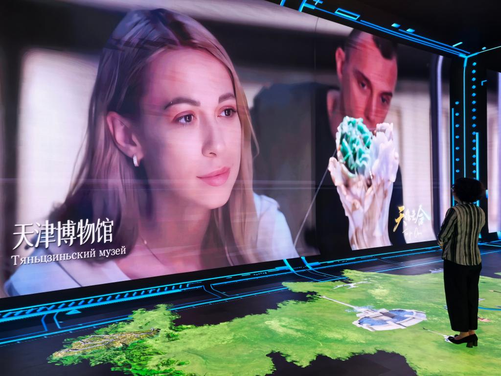 從上海東方明珠塔出發,一只和平鴿飛過青島,又越過北京,隨后路過白俄羅斯、印度、哈薩克斯坦等國家……中外媒體記者可以在新聞中心8K超高清沉浸式互動體驗區,感受上合組織國家的風土人情和文化特色。