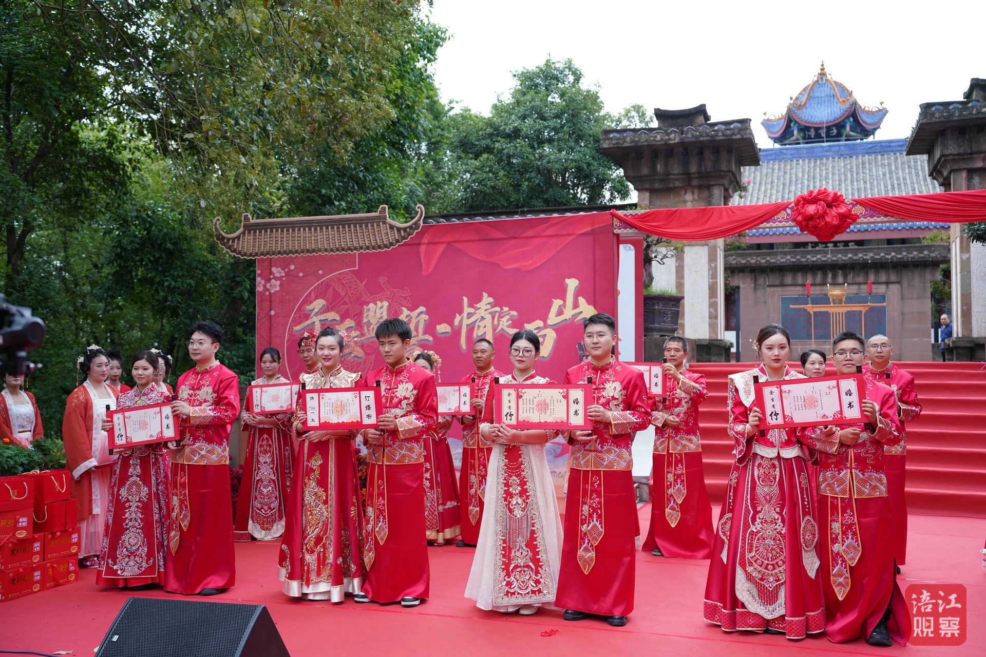 撒喜豆、沃盥禮、合巹禮、結(jié)發(fā)禮……8月28日,在綿陽市西山公園子云亭下,“子云盟誓·情定西山”紅色背景板鮮艷奪目,20對新人以簡約而莊重的儀式,踐行婚俗新風,開啟婚姻幸福新篇章。