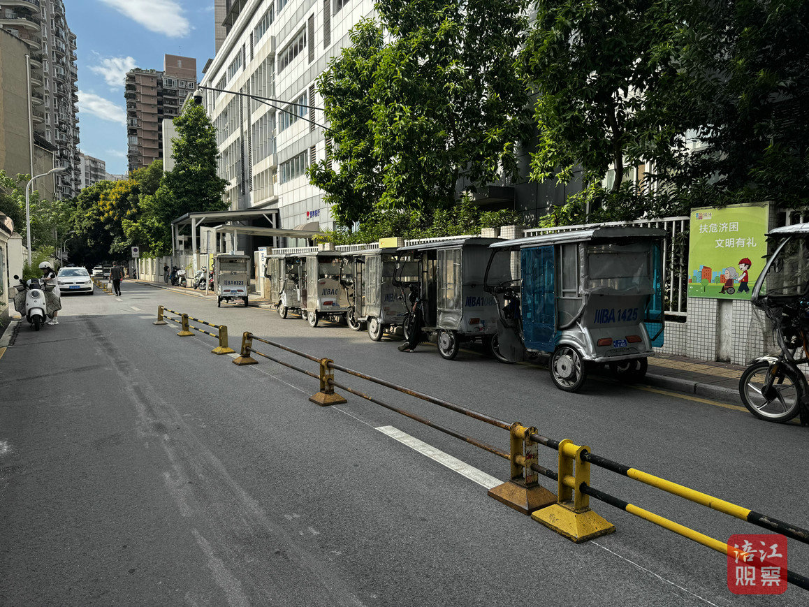 此外,在該路段靠近醫院西門的位置,記者還發現一整排逆向停放的待客三輪車,幾乎占據了一條車道。這一長期存在的現象與新增的隔離欄形成了疊加效應,進一步影響了通行效率。過往機動車行經此處時,只得小心翼翼通行。