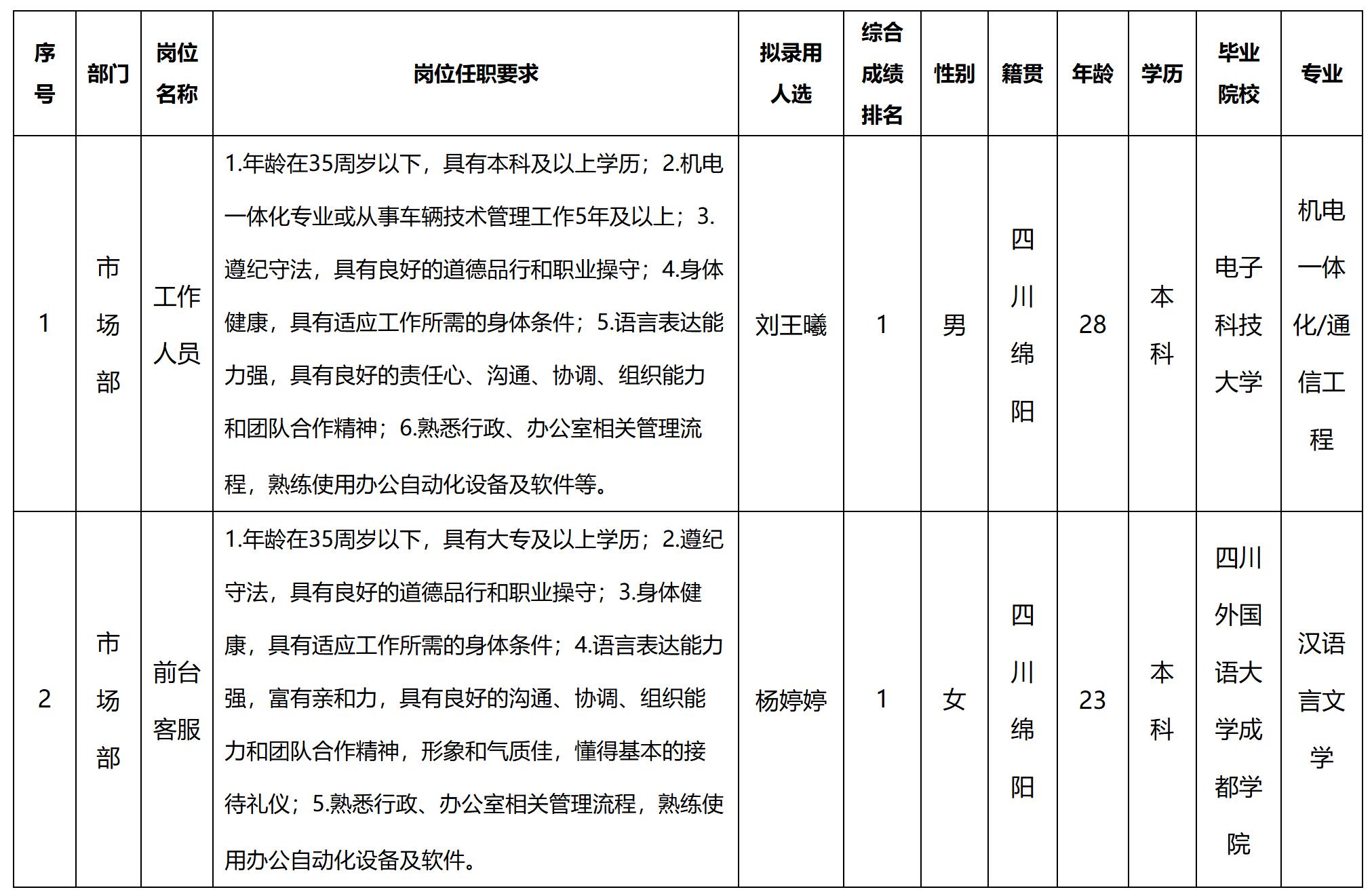 根據綿陽市公交遠航汽車服務有限責任公司發布的招聘公告及招聘相關規定,經筆試、面試、考察、體檢等程序,擬錄用劉王曦等同志到綿陽市公交遠航汽車服務有限責任公司工作,現予以公示,具體情況如下: