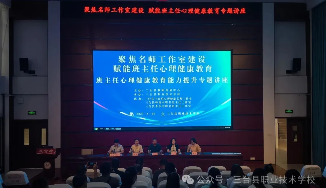 為了深化名師工作室建設,強化班主任心理健康教育能力,推動中職育人工作高質量發展,8月26日,由三臺縣教師發展中心主辦,三臺縣職業技術學校承辦,三臺縣蘭松柏心理健康名師工作室、曾艷中職名班主任工作室、李莎中職名班主任工作室協辦的“聚焦名師工作室建設,賦能班主任心理健康教育”專題講座在三臺縣職業技術學校順利開展。三臺縣教師發展中心專家周春梅、第三人民醫院科教部主任顏華,三臺縣職業技術學校黨委副書記、副校長潘海彬,名師工作室負責人及成員,班主任代表共計80余人參會,共探心育新路徑。
