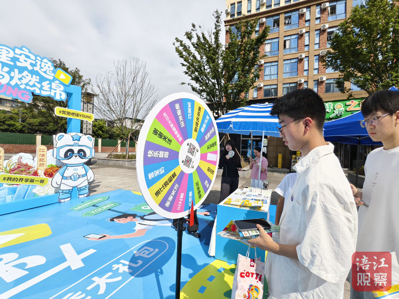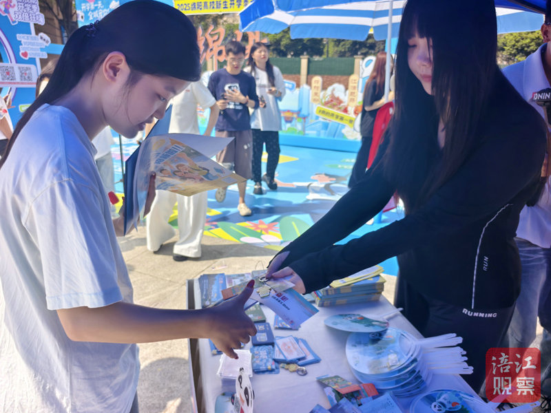 記者在現場看到,辦理完入學手續的新生們在此排起了長隊,他們手拿現場發放的活動宣傳單、文旅消費券以及鑰匙扣、書簽等文創產品,準備進行抽獎環節。隨著一聲聲喝彩,來自西昌的現代技術學院新生海來點好,抽中了三江湖的游船票。他滿意地表示,運氣好抽中了船票,周末可以約同學一起去坐游船欣賞涪江美景。