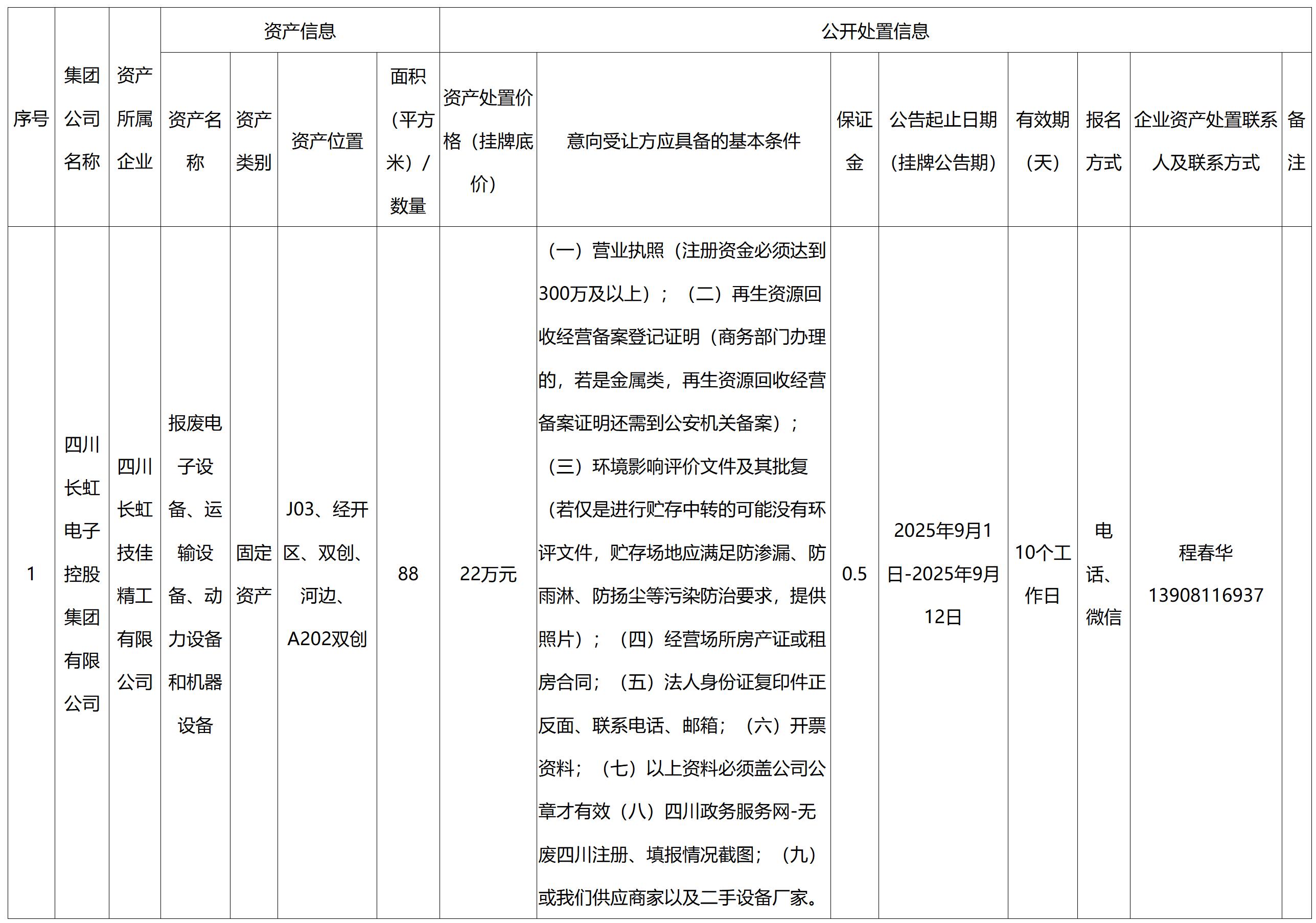 四川長虹技佳精工有限公司資產處置公告