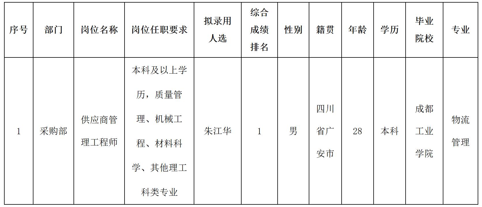 根據(jù)四川波鴻實業(yè)有限公司發(fā)布的招聘公告及招聘相關(guān)規(guī)定,經(jīng)面試、體檢等程序,擬錄用朱江華同志到四川威斯卡特工業(yè)有限公司綿陽分公司工作,現(xiàn)予以公示,具體情況如下: