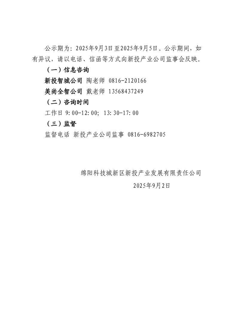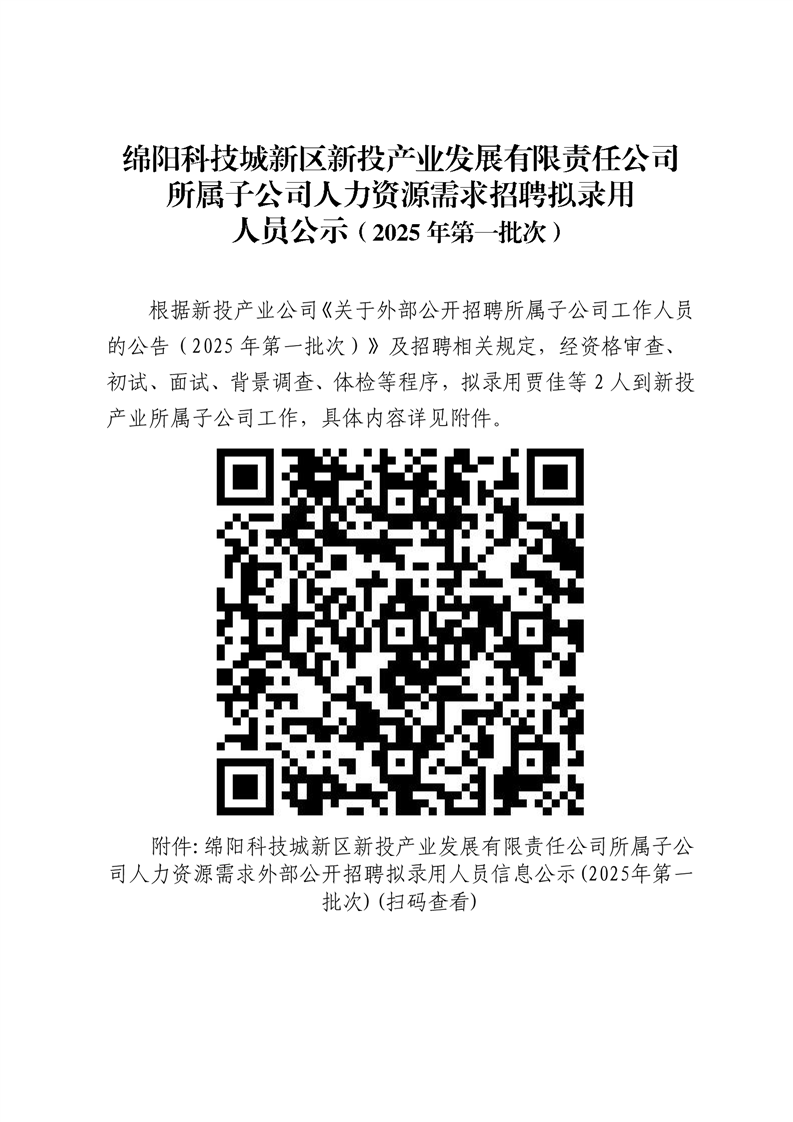 綿陽科技城新區新投產業發展有限責任公司所屬子公司人力資源需求招聘擬錄用人員公示(2025年第一批次)