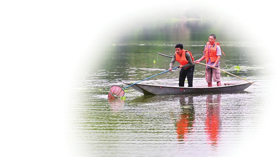 眉山天府新區北斗鎮石河村的志愿者打撈河面漂浮物。 彭雅靈 攝