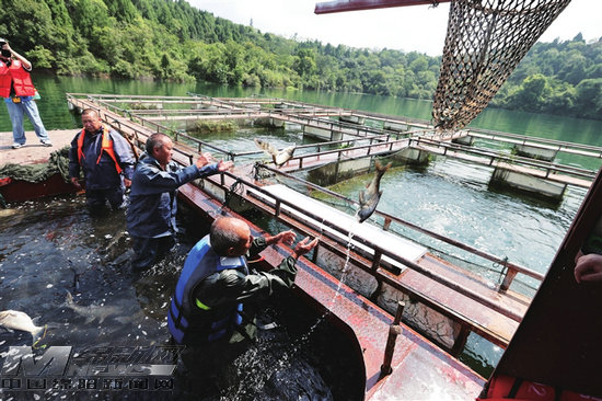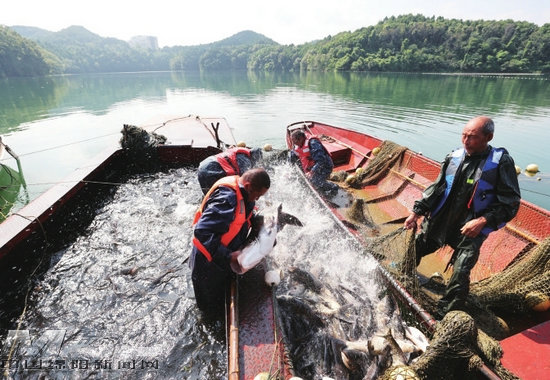 記者看到,這些魚中有花鰱、白鰱、草魚、青魚等,工人們將通過篩選的魚放進(jìn)運魚船,將部分小魚放進(jìn)湖中,讓它們繼續(xù)生長。“仙海湖中的魚沒有人工投喂任何飼料,全靠食用湖中天然的生物和水生植物生長。”仙海生態(tài)漁業(yè)有限公司工作人員張超介紹,目前,每天有數(shù)百公斤仙海魚被送到仙海區(qū)內(nèi)17家簽約漁莊,這些魚兒的頭部都會打上“仙海有機(jī)魚”激光標(biāo)記,供市民游客嘗鮮。