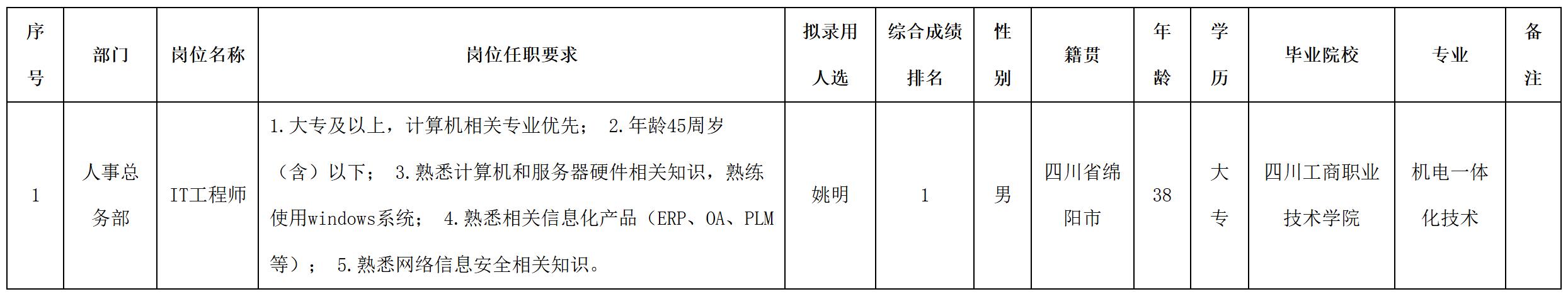 根據四川安和精密電子電器股份有限公司發布的招聘公告及招聘相關規定,經筆試、面試、考察、體檢等程序,擬錄用姚明同志到四川安和精密電子電器股份有限公司工作,現予以公示,具體情況如下: