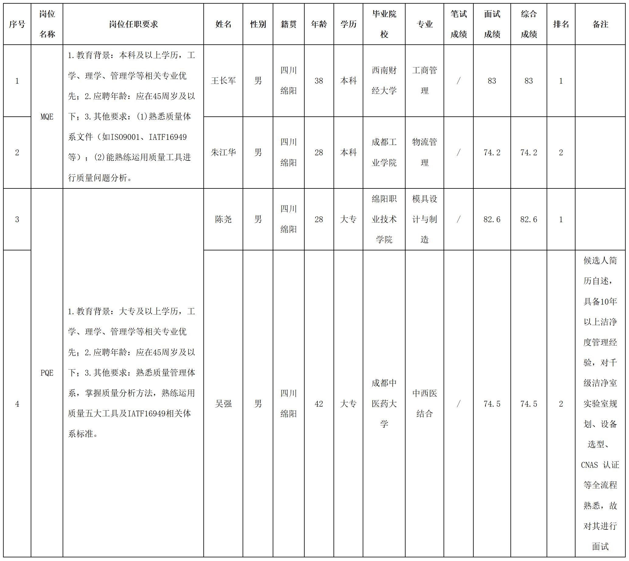 根據四川九州電子科技股份有限公司發布的招聘公告及招聘相關規定,經筆試、面試等程序,現將筆試(面試)成績予以公示。