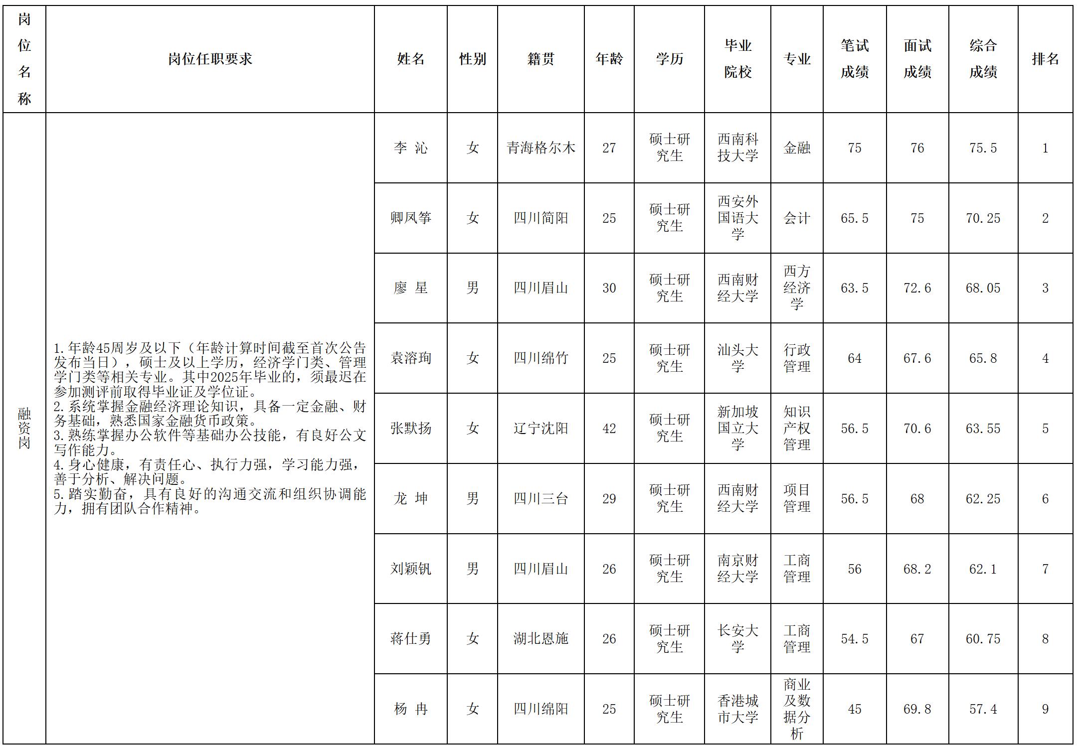 根據綿陽金控投資管理有限責任公司發布的招聘公告及招聘相關規定,經筆試、面試等程序,現將筆試(面試)成績予以公示。