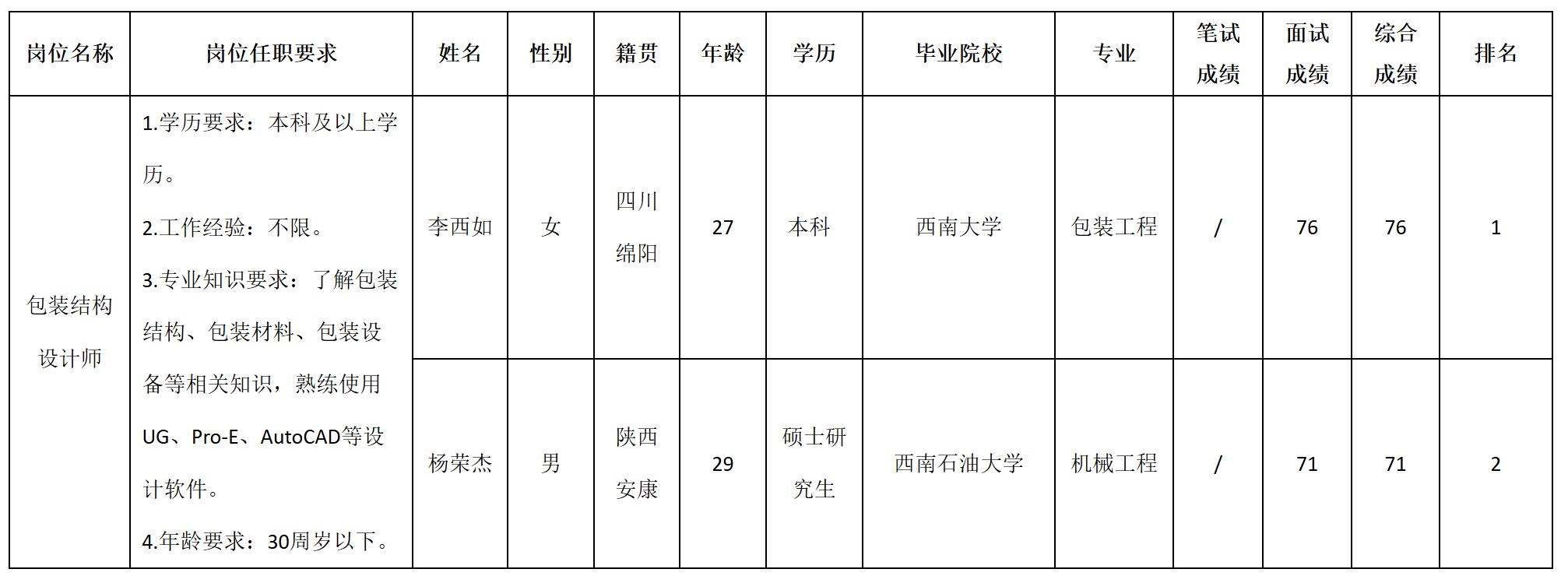 根據四川長虹包裝印務有限公司發布的招聘公告及招聘相關規定,經筆試、面試等程序,現將筆試(面試)成績予以公示。